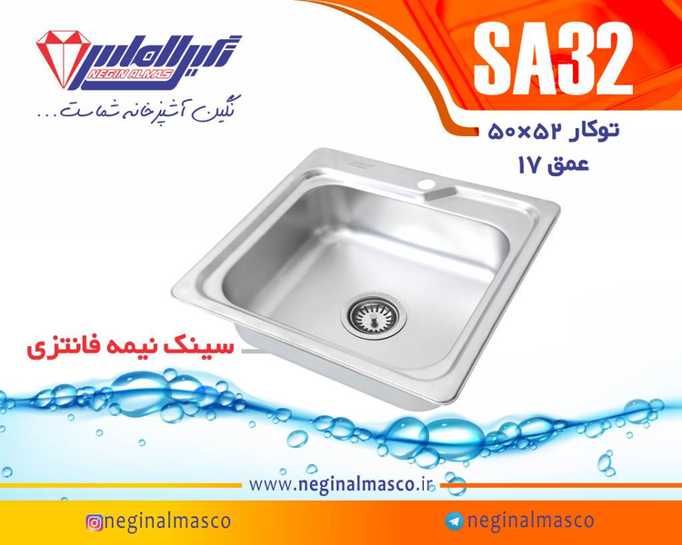 کد 32 نگین الماس به احتمال زیاد اشاره به سینک ظرفشویی مدل SA32 توکار از برند نگین الماس دارد. این سینک از جنس استیل و یک لگنه با ابعاد 480 × 480 میلیمتر و عمق لگن 170 میلیمتر است